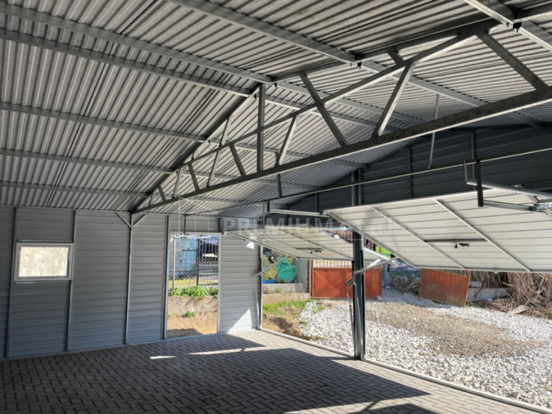 | Bramy: | Dwie uchylne do góry, blacha w panelu pionowym T7 |